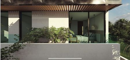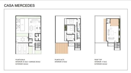de alberca y terraza (NPT: 0.22 mts) acompañada con una barra para cocinar al exterior,así como un garaje con capacidad para dos autos (29.6 m2). Sumando al interior 81.4 m2 de construcción y al exterior 94.6 m2.