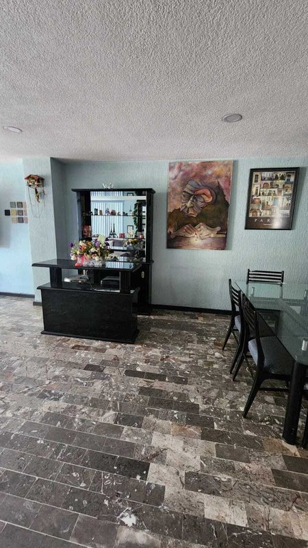 Cuenta con recibidor y una estancia de sala-comedor, cocina integral (área de lavado y tendido), 3 recámaras (la principal con baño completo y vestidor), 1 baño completo, 2 lugares de estacionamiento con portón eléctrico y cuarto de servicio en la azotea.