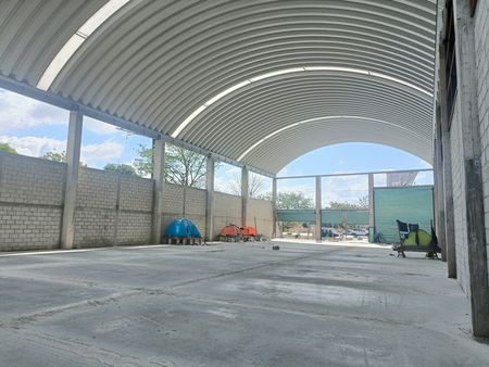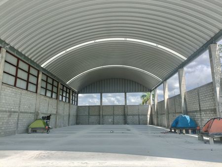 Arcotecho de lámina pintro, con altura de 9.50 m parte más alta y 7.50 m parte más baja.