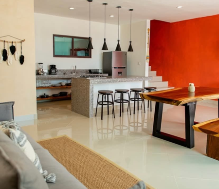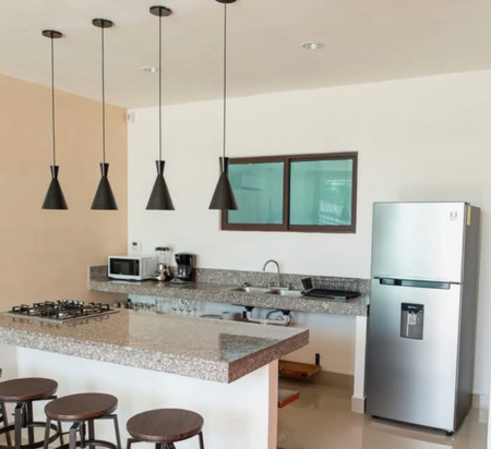Cocina open plan equipada con estufa, refrigerador, cafetera, micro ondas y
