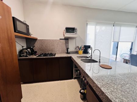Al ingresar inmediatamente, está la sala y comedor combinados, a través de unos ventanales podrás observer la alberca. Hay dos recámaras en `planta baja, la principal con su closet vestidor y baño completo, la recamara secundaria con closet, hay un baño compartido para visitas y esta recámara. La cocina completamente equipada con meseta de granito. Por último hay un garage para dos autos y área de lavado.