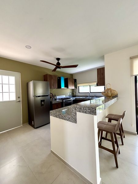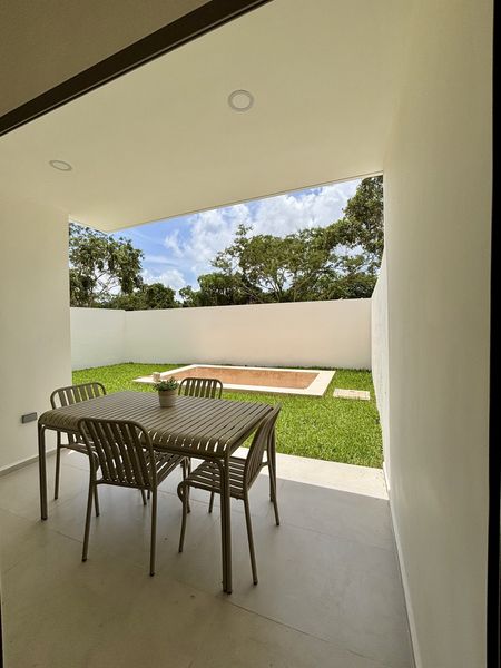 En la , cuenta con cochera sin techar para dos autos. La y el comedor tiene vista directa a la terraza exterior, integrándose a una cocina abierta con mesetas de granito. En la parte trasera se encuentra el área de jardín. (La alberca puede añadirse con costo adicional).