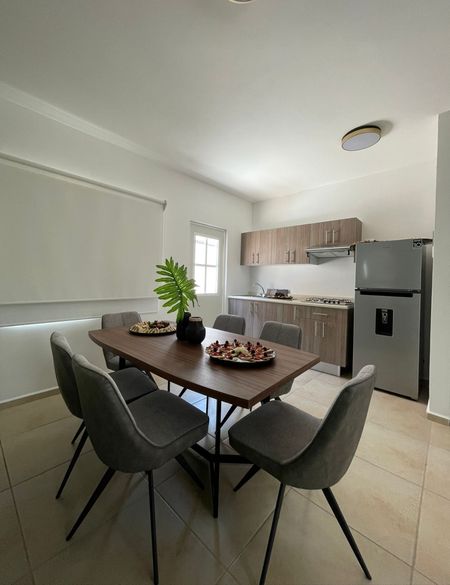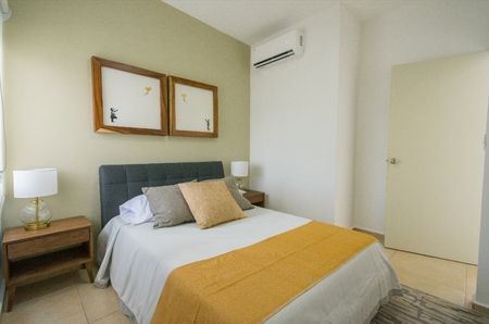 Casa de dos plantas y dos habitaciones ubicada en una privada al Norte de Cancún, cuenta con varias áreas comunes llenas de vegetación para pasear y ejercitarte, tiene un espacio especial para que tus mascotas puedan disfrutar de sus paseos y juegos, además puedes pagar la mensualidad de la Casa Club que cuenta con alberca, gimnasio, espacio para reuniones, y actividades recreativas.