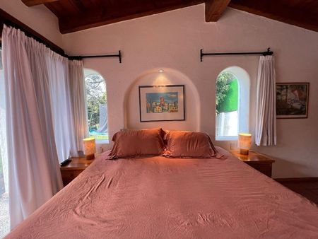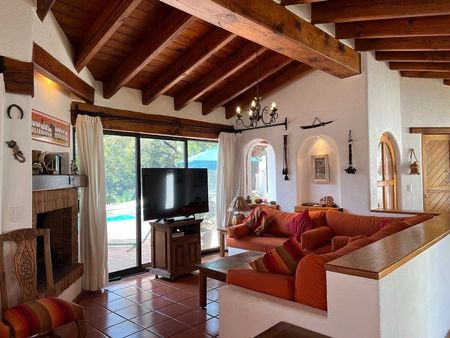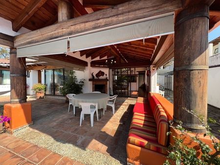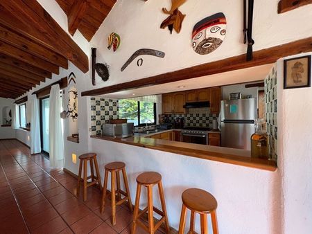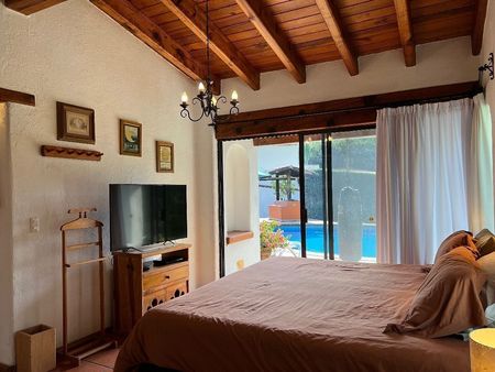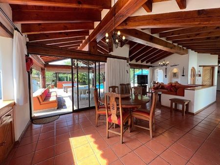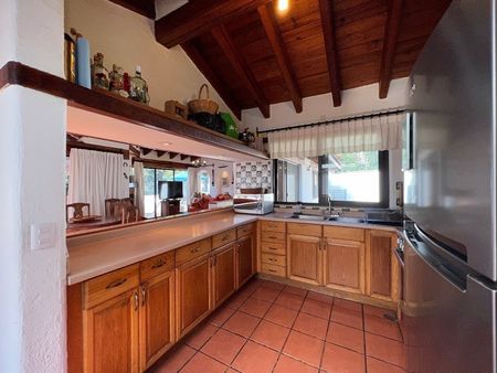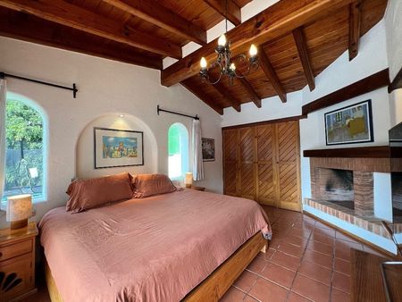 Está casa en Avándaro está verdaderamente bien ubicada. Se puede caminar a la zona comercial del pueblo y a los restaurantes. El terreno de 1,896m2 alberga un jardín envidiable, con juegos infantiles, alberca, jacuzzi, asador, terraza y comedor exterior. La casa principal de 143m2 cuenta con 3 recámaras, 3 baños, sala, comedor, cocina abierta, un cuarto de lavado y uno de servicio con baño que también puede fungir como recámara adicional.