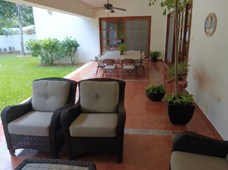 Hermosa y amplia residencia, dentro del exclusivo complejo Residencial del Club de Golf La Ceiba, vigilancia las 24 horas de los 365 días del año. Perfecta ubicación, ya que se encuentra frente al parque para que sus hijos jueguen y convivan de forma segura.