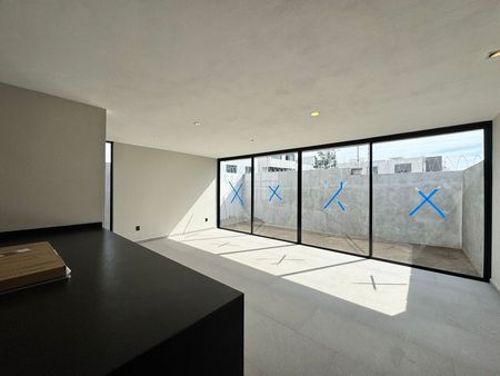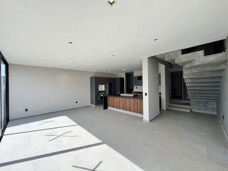El área social es abierta y se integra con la cocina, la cual cuenta con barra desayunadora de granito y alacena, junto al patio de lavado. Toda esta área se conecta al jardín privado mediante un gran ventanal de casi 3 metros de altura.
