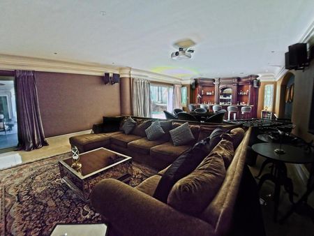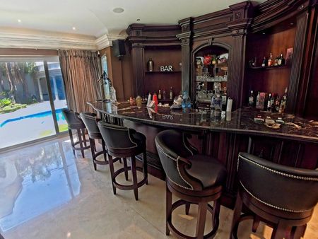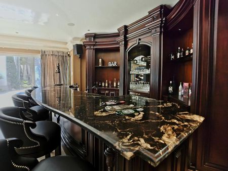 - Sala de juegos con elegante bar de cuarzo y pantalla gigante, muebles empotrados en caoba sólida.