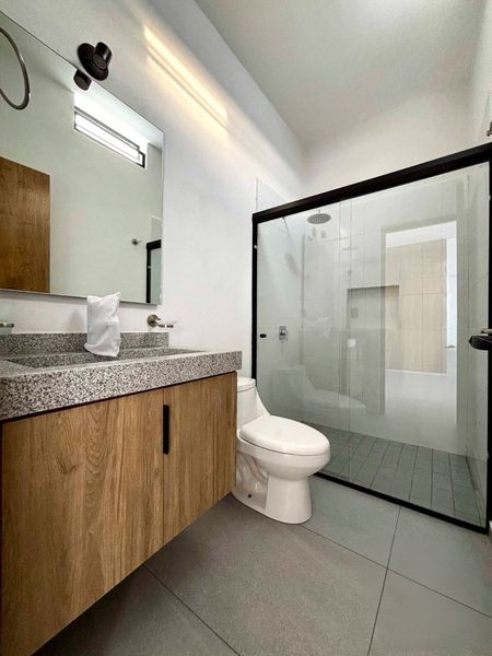 3 recámaras (principal con baño), 3 recámaras con clóset, 2 baños completos, lavabos de granito, patio de lavado, cocina integral amplia con granito e isla, sala, comedor a altura y media, 3 jardínes interiores, piso rectificado 100x50.