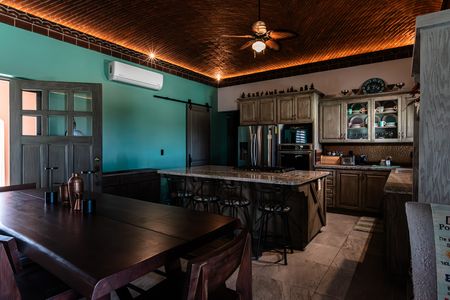 Cocina con isla de gran tamaño de granito, electrodomésticos de acero inoxidable, gabinetes de calidad, alacena grande.