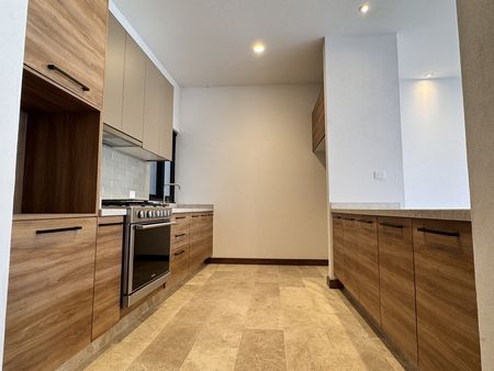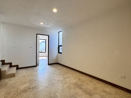 Planta baja: Recibidor, sala comedor con vista al jardín, cocina integral con amplia alacena y barra desayunador, que conecta con el área social, patio de lavado con entrada independiente desde cochera, bodega debajo de escaleras, 1/2 baño de visitas, cochera para 2 autos, pisos en mármol travertino, soclo de madera, piso laminado en las recamaras y hall.