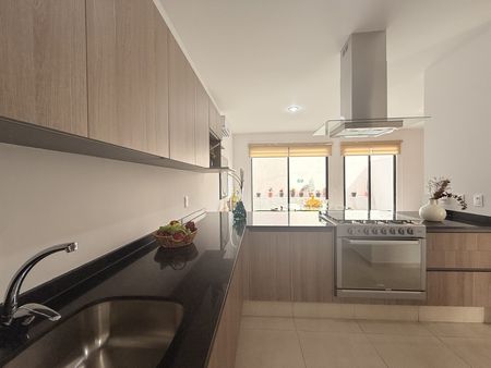 Cocina integral con estufa de 6 quemadores, campana extractora y horno convencional y barra de granito