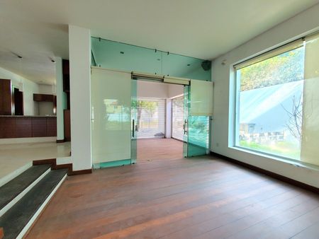 Espectacular ventanal de cristal templado con vista panorámica al parque en el área de la escalera, la cual tiene escalones de madera e iluminación LED. Sala de TV con un gran mueble de madera empotrado.