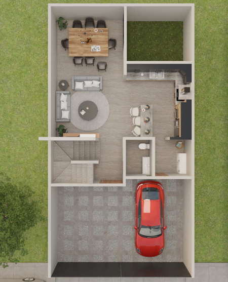 Casa habitación de dos plantas, medio baño, sala-comedor con una amplia doble altura y barandal de cristal templado, cocina integral con isla, tarja y estufa con cubierta de granito, barra desayunadora , jardín y área de lavado.