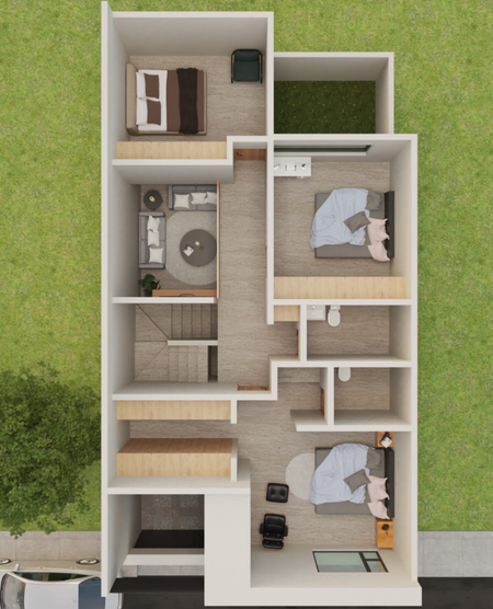 Planta Alta: Recamara principal con baño completo y vestidor, dos recamaras secundarias con closet y un baño compartido, septico.
