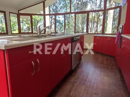 ¡¡Excelente oportunidad!! Se vende hermosa casa tipo chalet a 20 minutos de lomas verdes ubicada en medio del bosque en zona ecológica protegida, muy tranquila y con mucho aire limpio de la montaña. 4 recamaras con baño (con mobiliario y accesorios nuevos y modernos) y vestidor, 2 de ellas con terraza, closets nuevos, piso de madera en excelentes condiciones, con calefacción y persianas. Estancia tipo loft, hermosa y amplia cocina integral con amplia despensa, comedor con ventana panorámica con vista al bosque. Sala acogedora. Juegos infantiles. Terreno en pendiente arreglado en terrazas. Un invernadero cubierto de 32 m2, área de servicio, lavanderia, cuarto de servicio, una cochera techada para 2 autos medianos. Espacio frente a la casa (dentro de la propiedad) para estacionar 6 autos o más. Caseta de vigilancia. Cuarto de velador o multiusos, con baño. Planta de luz a gas, terreno delimitado con barda de malla ciclónica.