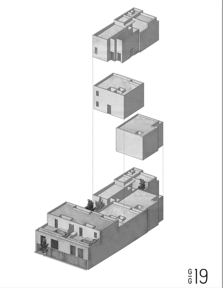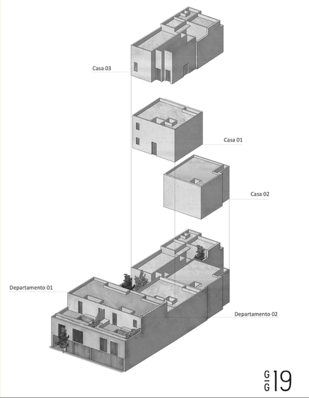 Las viviendas 01, 02, 03 están distribuidas en dos niveles cada una, con patios interiores para iluminar y ventilar las distintas áreas.