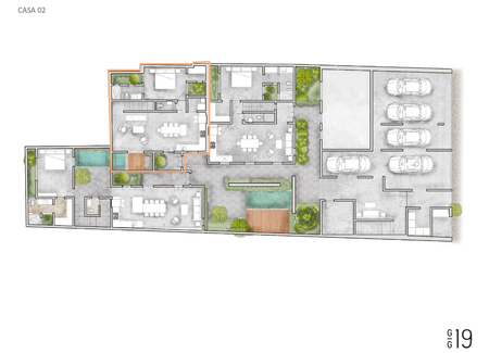 En el interior se encuentra un patio con piscina, árboles y circulaciones jardinadas que distribuyen a tres diferentes viviendas independientes.