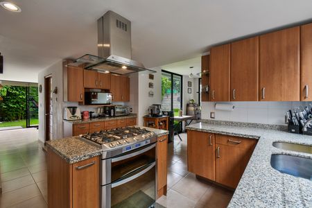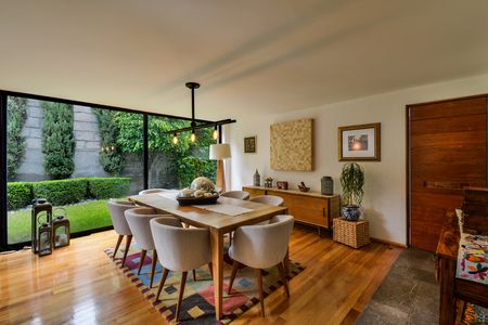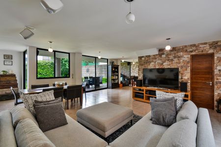 La casa te ofrece dobles alturas, techos altos, espacios muy luminosos y espaciosos. En planta baja cuenta con vestíbulo, sala con chimenea y bar con vista al jardín, comedor con salida al jardín, estudio, medio baño, cocina equipada con antecomedor, gran family room que se integra a una terraza techada y al jardín. En planta alta, recámara principal con vestidor y baño, 2a recámara con vestidor y baño, 3a recámara con closet y baño y estudio independiente o 4a recámara sin baño. Tiene 5 estacionamientos techados para autos grandes.