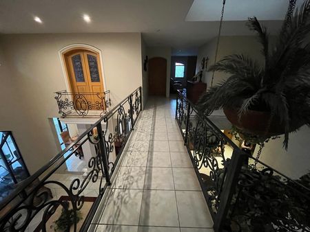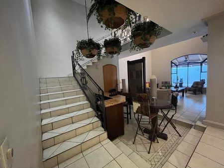 Primer nivel: cochera para 5 autos, estudio con clóset, bar, sala a doble altura, cocina, cuarto de servicio, terraza techada y patio.