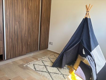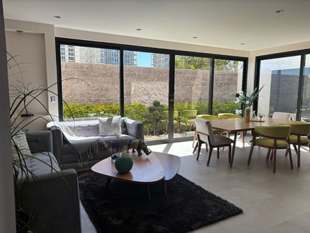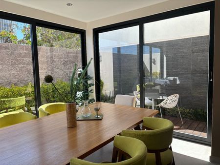 Tiene 3 niveles, 4 recámaras, 5 baños completos, área de TV, jardinera en recámara principal en planta baja, entrada lateral al jardín, y roof garden.