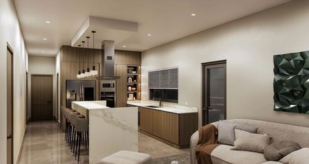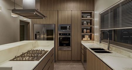 • Cocina e isla de MDF con cubiertas de cuarzo.