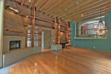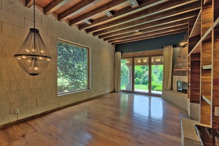 Entrando a la casa a tu lado derecho tienes una hermosa sala de buena altura en techos con vigas de madera, con chimenea ya convertida a gas y amplios ventanales biselados. que miran al jardín, del otro lado un amplio comedor con vista también al jardín, una bellísima y amplia cocina de diseñador con desayunador hecha especialmente para disfrutar de muchas reuniones con tu familia, buena despensa y mucho lugar de guardado en la cocina.