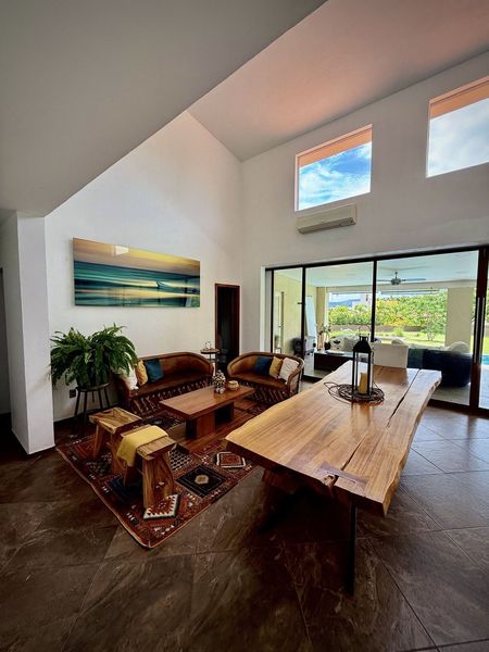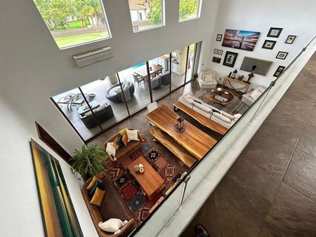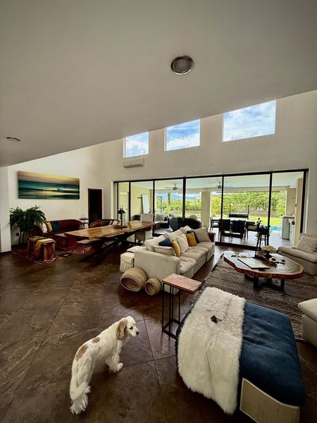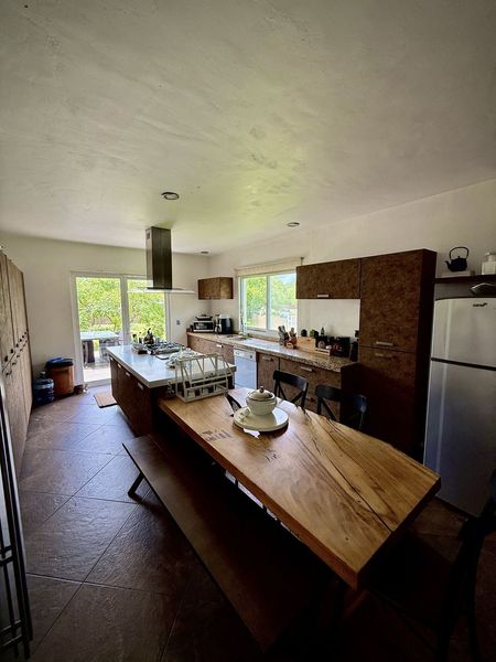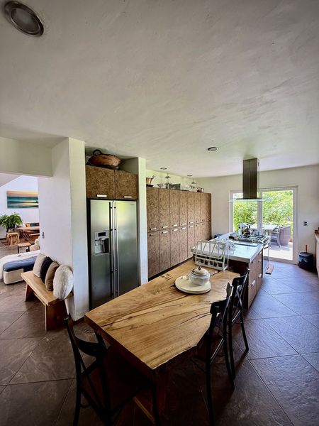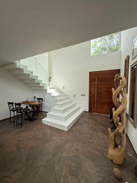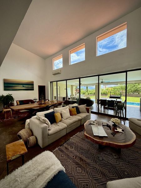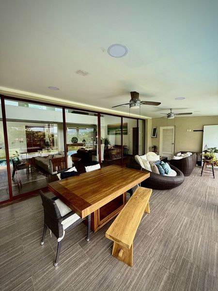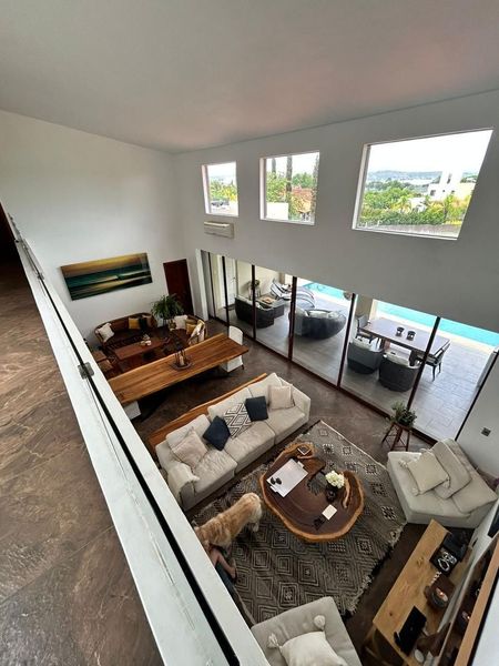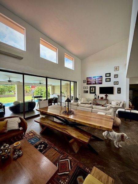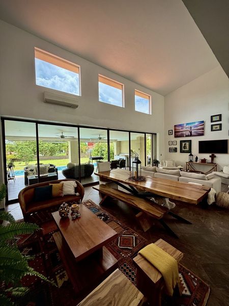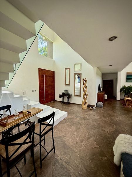 La casa cuenta con: Cocina, sala-comedor de doble altura, recámara principal con terraza vestidor y baño con tina, otras 2 recámaras en planta alta con baño compartido, 2 recámaras en planta baja con baño cada una, medio baño de visitas , cocina con famili room, en la terraza un departamento pequeño de visitas, tiene terraza, alberca infinita con caldera, asador, fire pit, una green de práctica de golf, paneles solares.