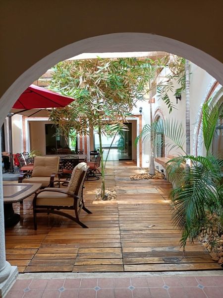 - Patio interior Techado de cristal y mallasombra con comedor con sombrilla y sala con sombrilla.