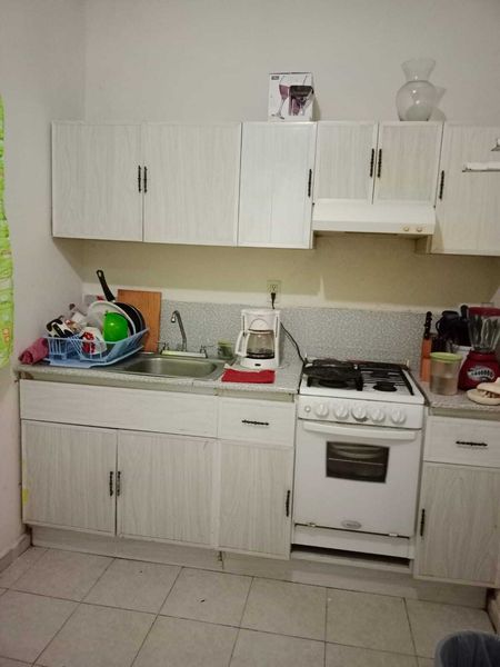 En planta baja cochera techada para un auto, área de sala comedor cocina en concepto abierto con barra des ayunadora, área de lavado y tendido, un medio baño de visitas.