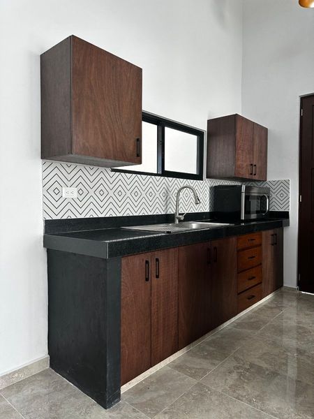 • Cocina abierta con meseta de granito negro y gavetas superiores e inferiores de