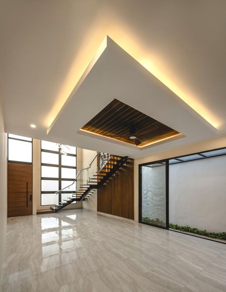 • Comedor con elegante plafón, detalles en madera e iluminación indirecta