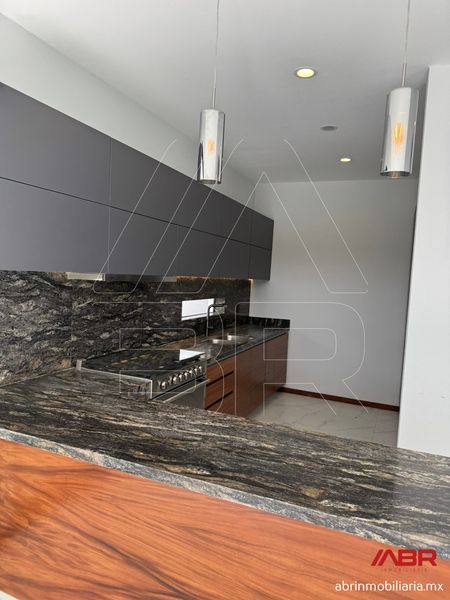 Sala y comedor integrados a una amplia cocina de lujo con granito exótico y carpintería en parota