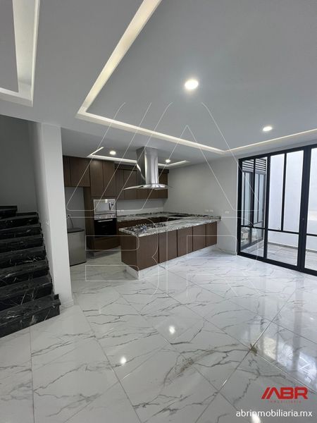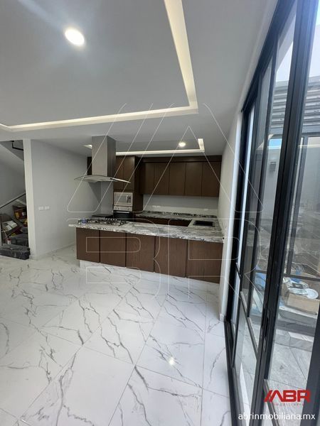 PLANTA BAJA: Cocheras 2 autos, medio baño de visitas, sala comedor, cocina integral cubierta de cuarzo con barra desayunadora, iluminación indirecta, cuarto de lavado y patio trasero.
