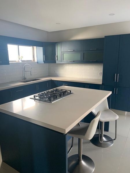 La cocina está totalmente equipada con gabinetes superiores e inferiores, refrigerador, horno eléctrico, horno microhondas, estufa y boiler.