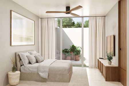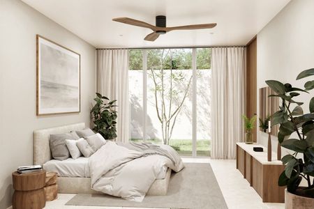 Recámara principal con jardín interior, amplio clóset vestidor y baño completo con