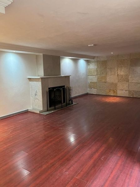 Primer nivel: Garage para 2 autos con puerta eléctrica, sala comedor con chimenea, fuente decorativa, medio baño, closet de visitas, cocina integral con desayunador independiente, terraza al jardín y dos recamaras con vista la jardín, con closet y baño completo compartido.