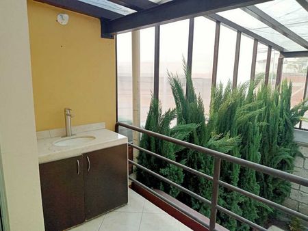 Sala, comedor, cocina integral, área de lavado,cuarto de servicio con baño, jardín, estacionamiento 2 autos.