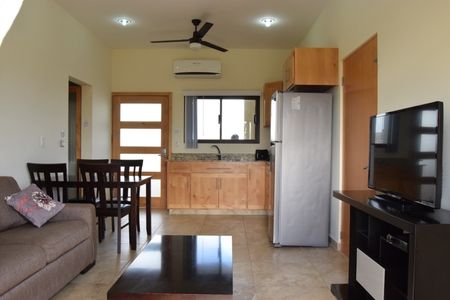 Se encuentra en 2do piso y está amueblado con decoración moderna ya equipado.Cuenta con 2 recámaras con cama queen. Smart tv. Terraza privada con vista increíbles a la bahía.