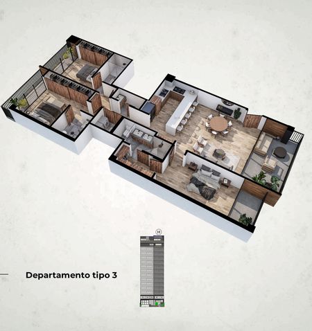 Distribución: cocina integral, 3 recámaras, balcón, 3.5 baños, 3 walking closet y área de lavado.