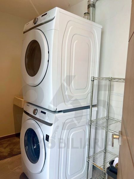Al lado se encuentra la cocina abierta y equipada con refrigerador, lava platos, horno y horno de microondas; adicionalmente posee buen espacio de almacenaje, alacena, y un área de lavandería con lavadora y secadora.