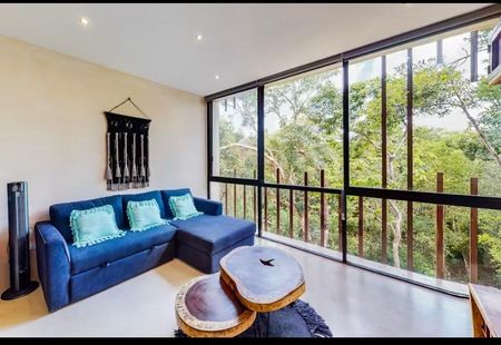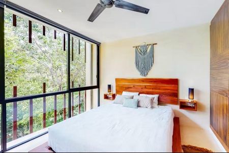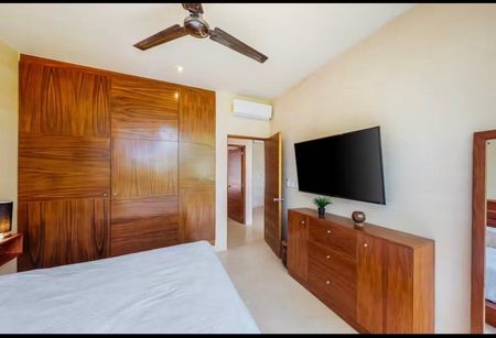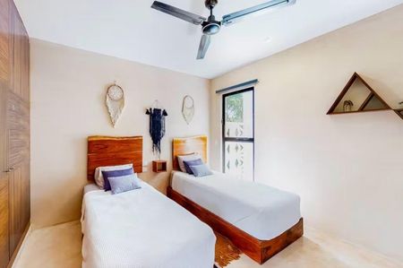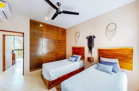 Departamento en renta en Tulum en Gardens Coba totalmente amueblado y equipado de 2 recamaras una con cama KS y la otra con dos camas individuales . Cuenta con lavandería común.