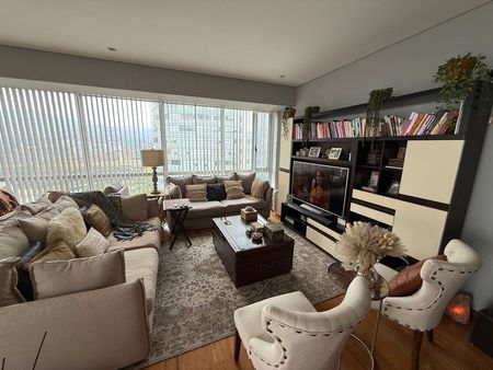 Departamento en Venta en HIGH PARK Santa Fe. Cuenta con 2 recámaras (principal con balcón y baño/closet, habitaciones secundarias con closet de pared y baño completo compartido), 2 baños, comples, medio baño de visitas, 2 lugares de estacionamiento, balcón de 10.2m2 hacia Av. Santa Fe, cuarto de lavado / servicio con baño completo y bodega. Vidrios de cocina, sala y comedor con pantalla protectora UV. Áreas comunesLudoteca, Gimnasio, Alberca, Salón de fiestas, Asadores, Canchas de Pádel, Jacuzzi, Sauna, Business center, Salón de adultos y Salón de Jóvenes. Vigilancia 24 horas.
