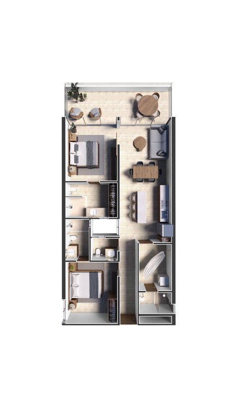 El desarrollo consta de una torre principal que abarca 41 departamentos, con cuatro tipologías diferentes para adaptarse a las necesidades y preferencias de los residentes.