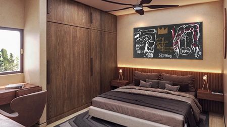 Recámara secundaria con baño propio, closet completo y escritorio para área de trabajo