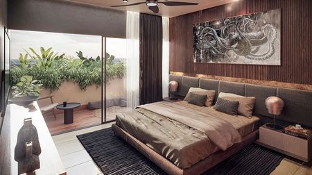Recámara principal con baño propio, closet completo y acceso a terraza con jardinera