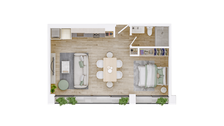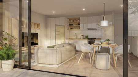 54 m2, 1 recamara, 1 baño completo, 1 estancia, comedor, cocina integral y área de lavado.