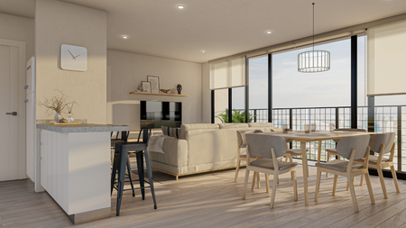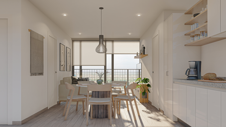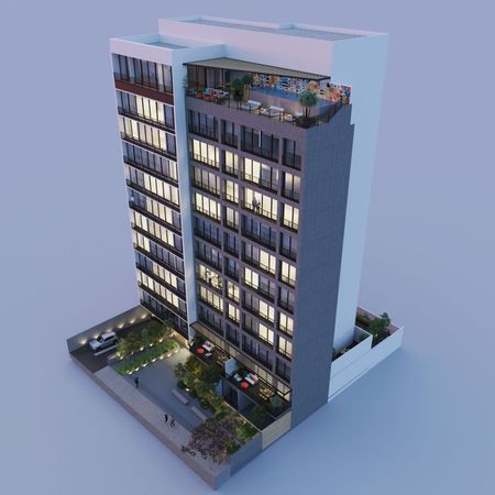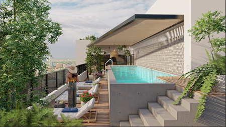 Roof con alberca, terraza con asoleaderos, cuarto de juegos, gimnasio, área de yoga, crossfit spot, coworking, lobby, cuarto de herramientas comunitario y delivery center.