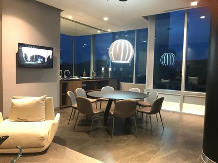 Área abierta de sala, comedor y cocina equipada con barra, 2 recamaras, 2 baños completos, sala, comedor, lavandería, 2 cajones de estacionamiento, persianas eléctricas y manuales en todo el departamento, clima central seccionado, vigilancia 24/7.