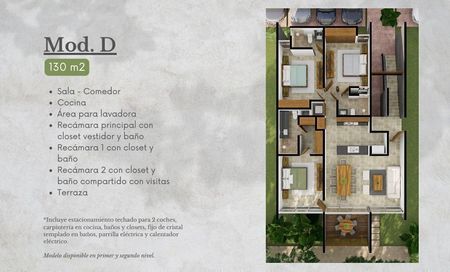 - Incluye estacionamiento techado para dos vehículos, carpintería en cocina, baños y clósets, fijo de cristal templado en baños , parrilla eléctrica y calentador eléctrico.