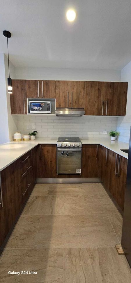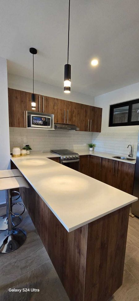 • Cocina con cubierta de cuarzo y carpintería superior e inferior